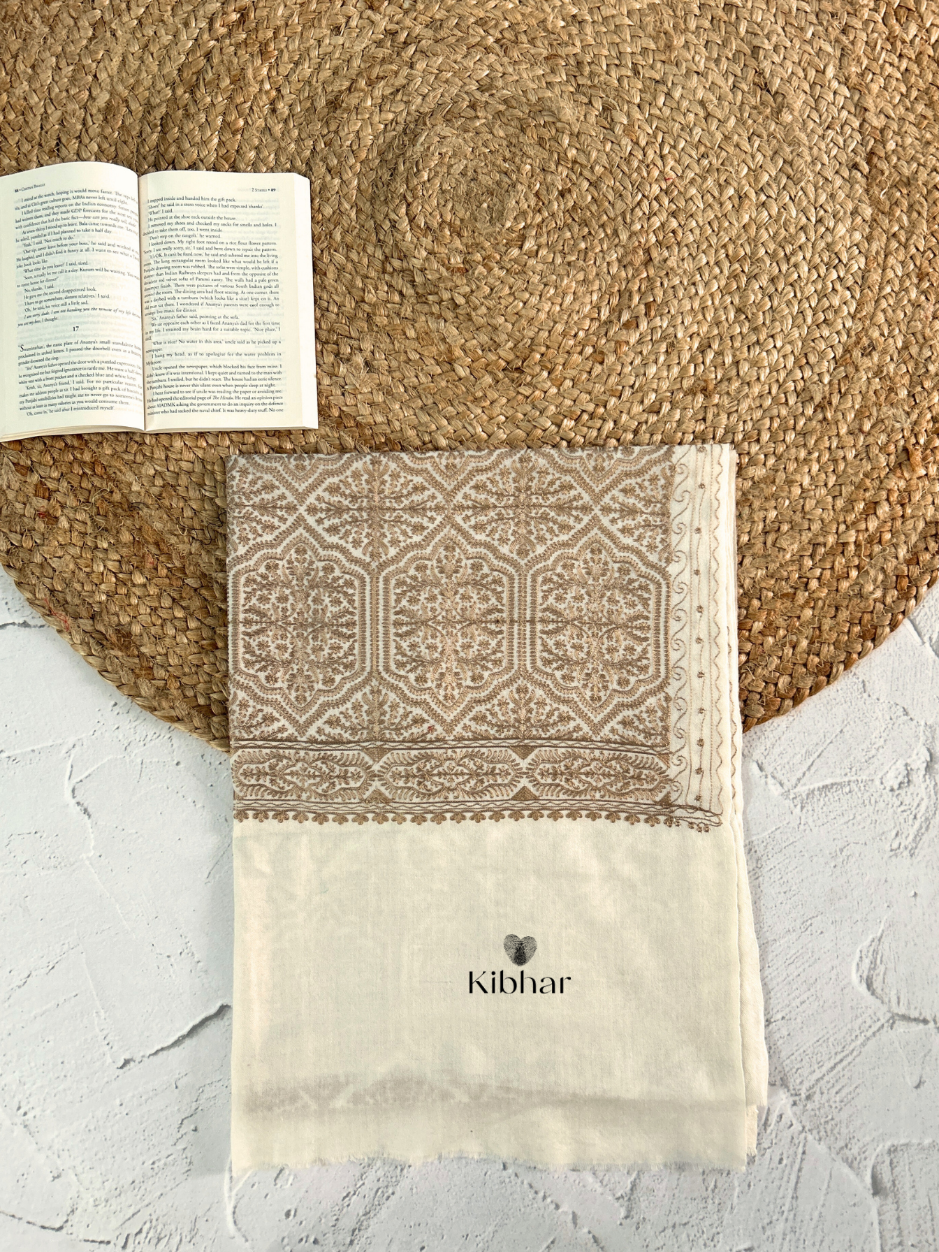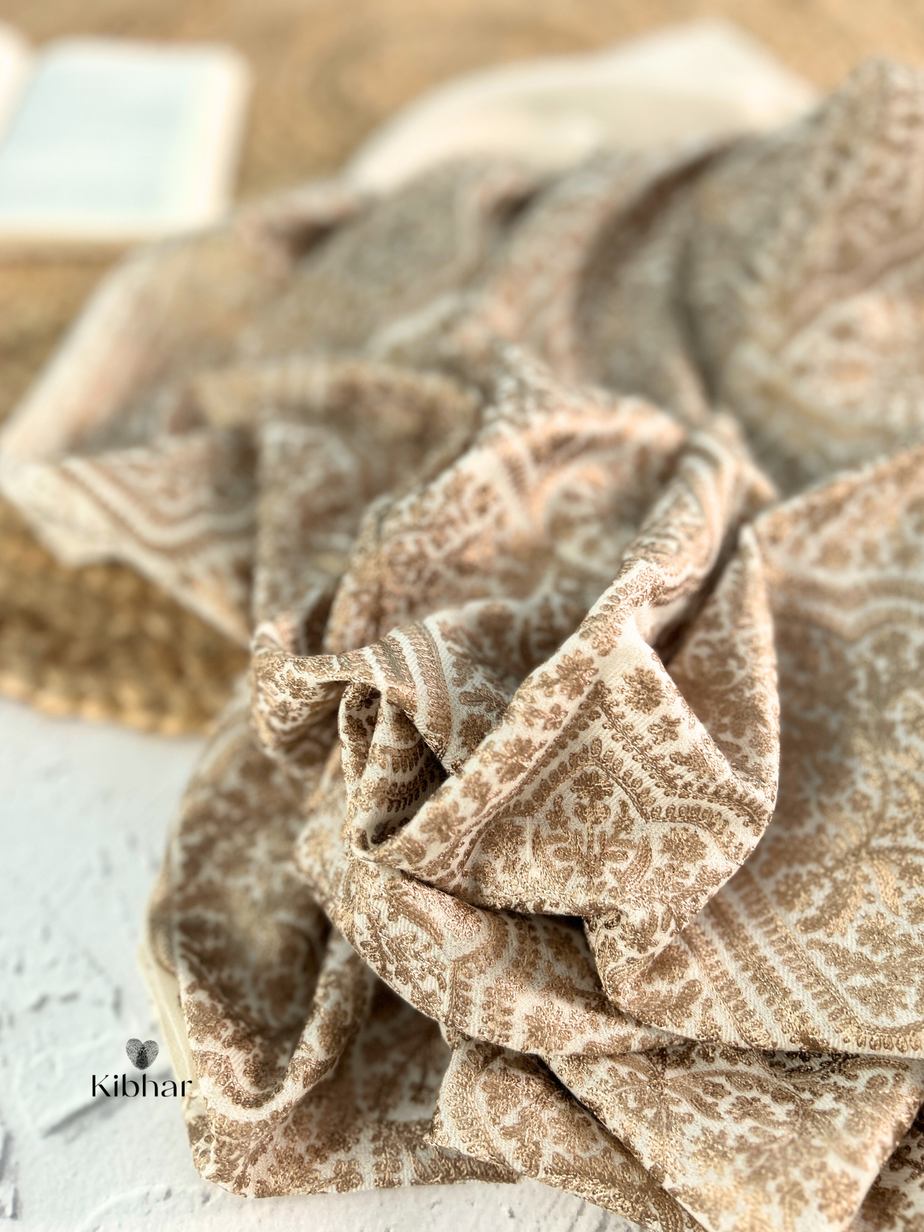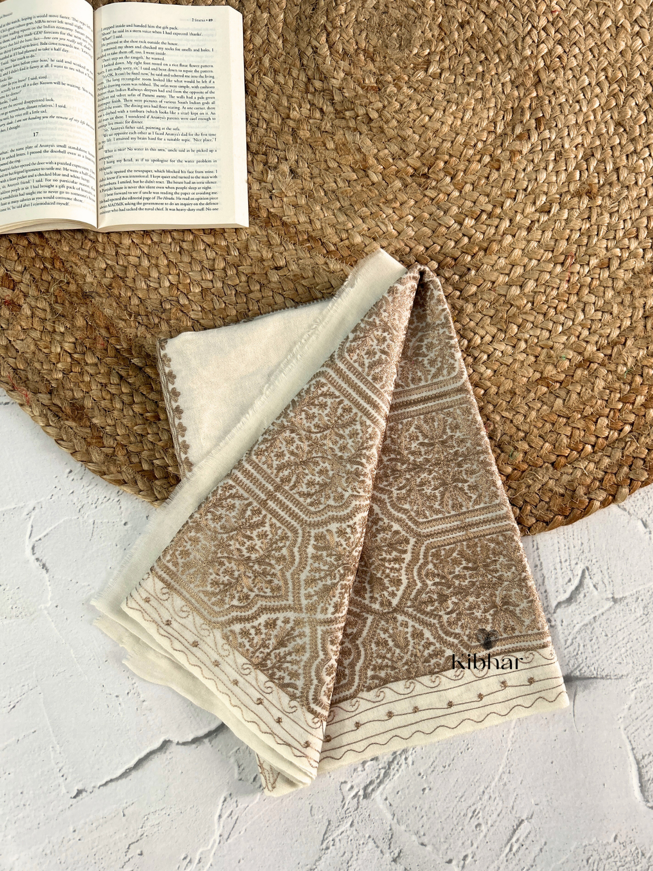 Brown Thread work pure fine wool Stole A luxurious accessory that effortlessly combines the softness of pure fine wool with a stunning cream color wool with brown thread work. Crafted with precision and care, this stole is a celebration of elegance and warmth.