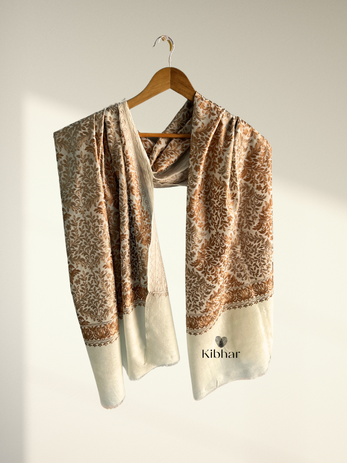 Golden Brown Thread work pure fine wool Stole A luxurious accessory that effortlessly combines the softness of pure fine wool with a stunning cream color wool with gold & brown thread work. Crafted with precision and care, this stole is a celebration of elegance and warmth.