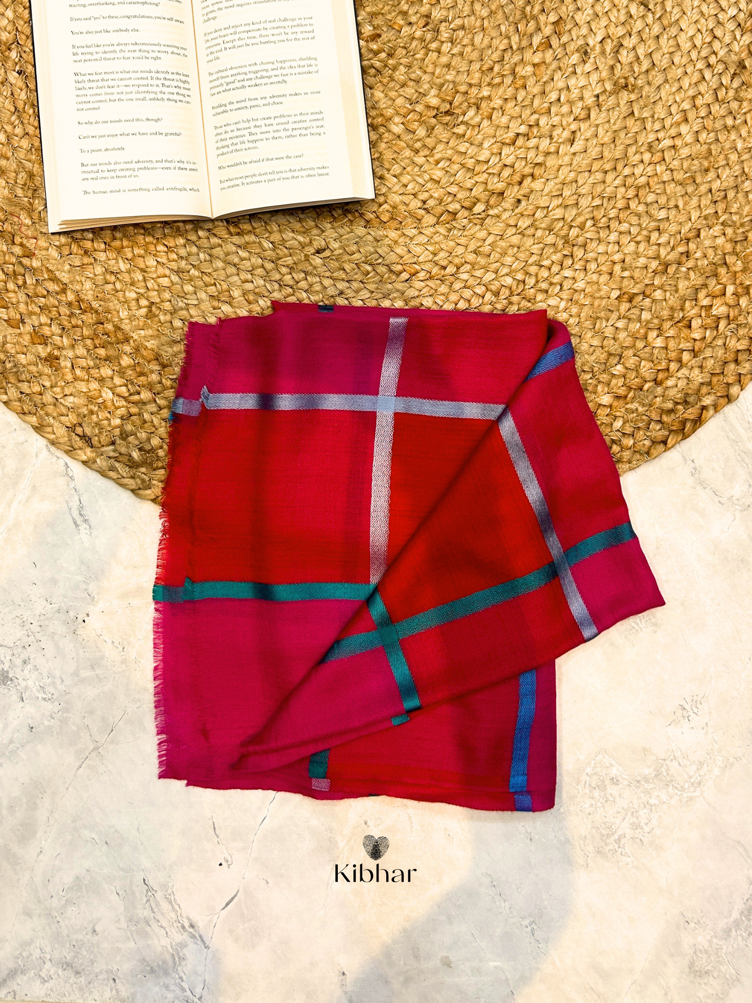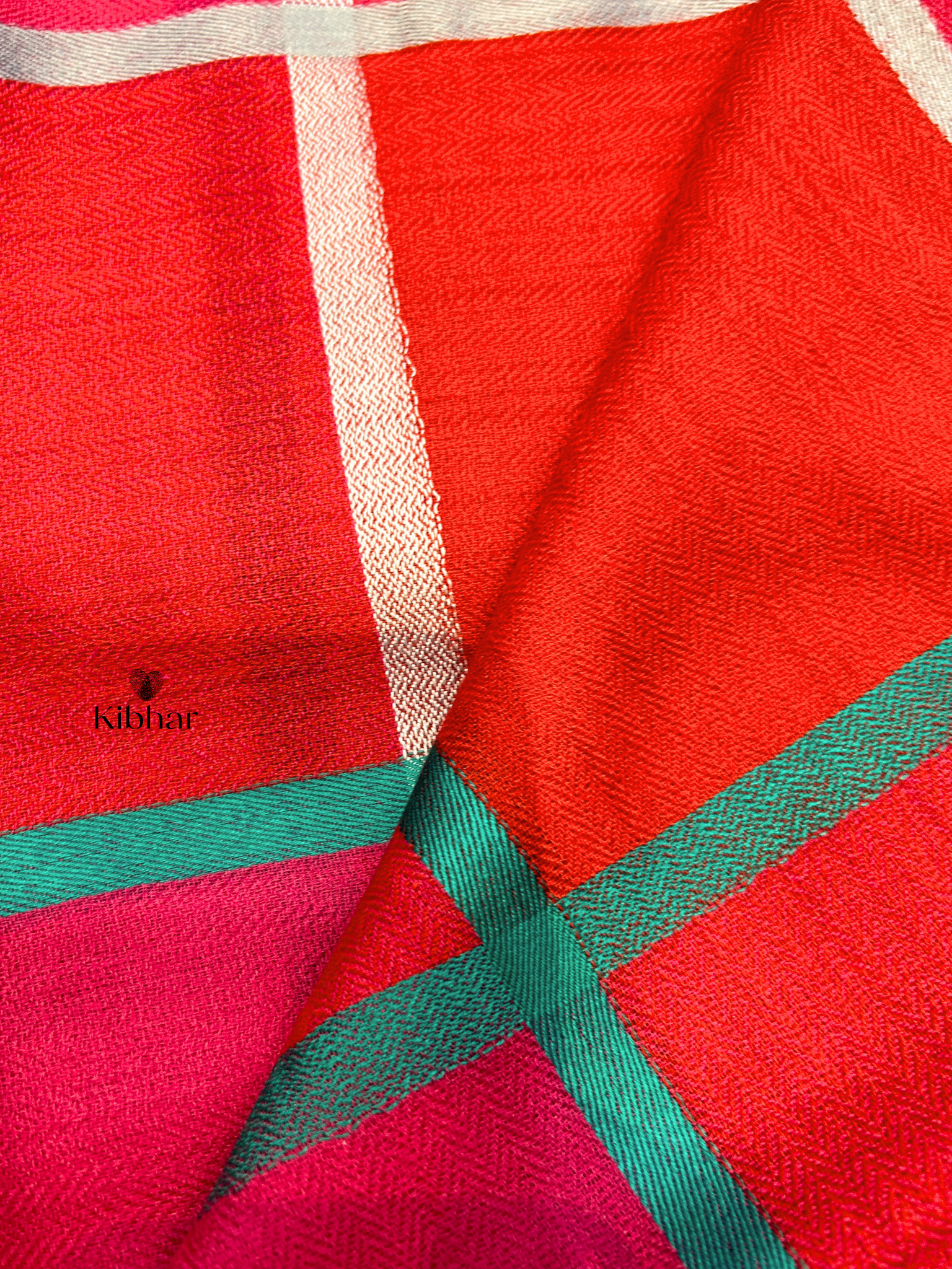 This vibrant stole in the blends the luxurious softness of cashmere and silk with a bold geometric design in striking hues of magenta and red. The intricate blue and silver accents add a touch of modern sophistication, making it an eye-catching yet elegant accessory. Carefully crafted to provide both warmth and style, this stole is perfect for elevating any look, whether for a casual day out or a chic evening affair.