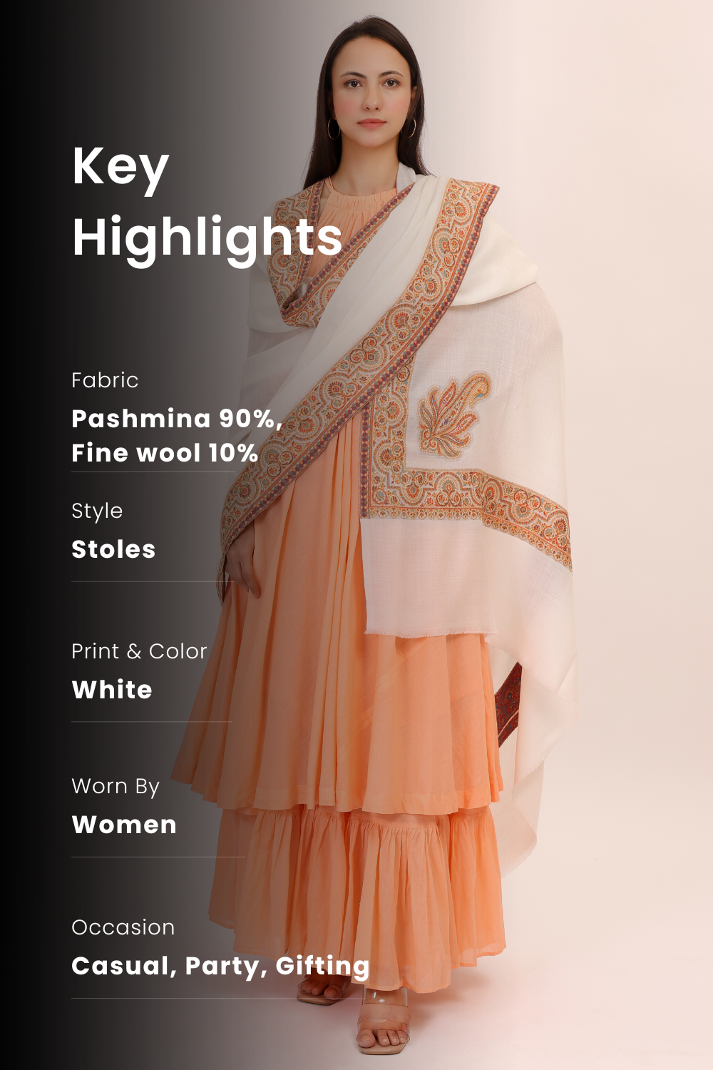 Wrap yourself in luxury with our Pashmina Fine Wool Shawl in classic white, featuring a vibrant multi-color woven border. Crafted from the finest pashmina wool, this shawl offers exceptional softness and warmth. The colorful border adds a touch of sophistication, making it a versatile and stylish accessory for any occasion.