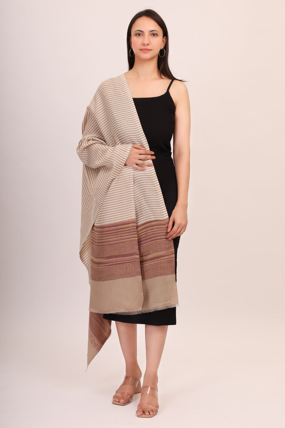 Discover refined style with our Pashmina Fine Wool Stole in a sophisticated brown striped weave. Crafted from luxurious Pashmina wool, this stole offers exceptional warmth and softness. The elegant striped pattern adds a modern touch to its classic design, making it a versatile accessory for both casual and formal wear. Perfect for adding a touch of sophistication to any outfit .