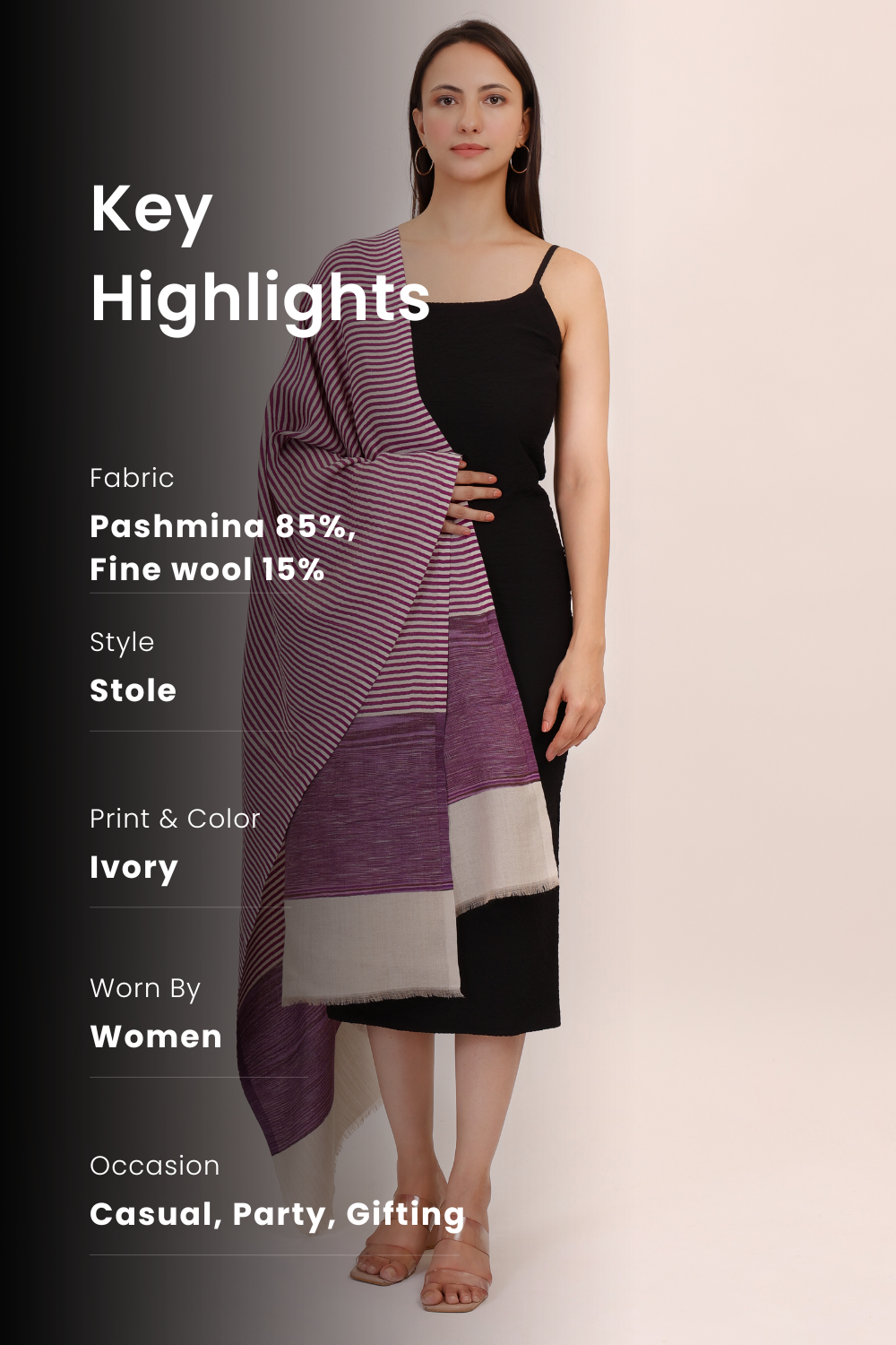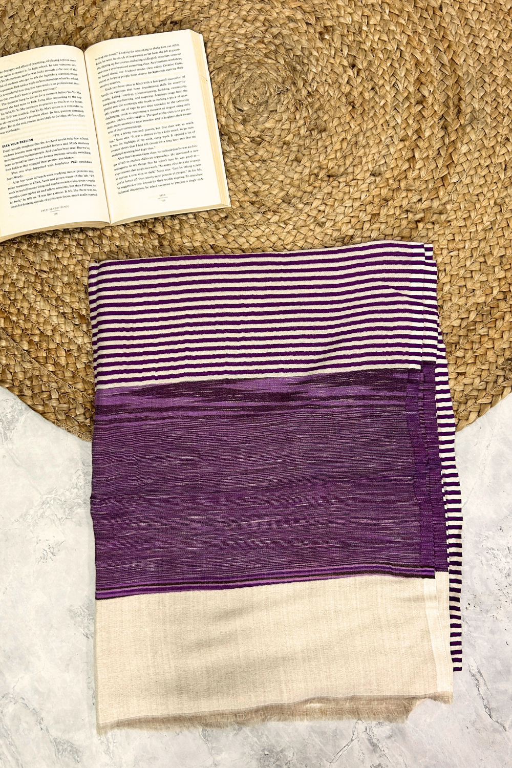 Discover refined style with our Pashmina Fine Wool Stole in a sophisticated purple striped weave. Crafted from luxurious Pashmina wool, this stole offers exceptional warmth and softness. The elegant striped pattern adds a modern touch to its classic design, making it a versatile accessory for both casual and formal wear. Perfect for adding a touch of sophistication to any outfit .