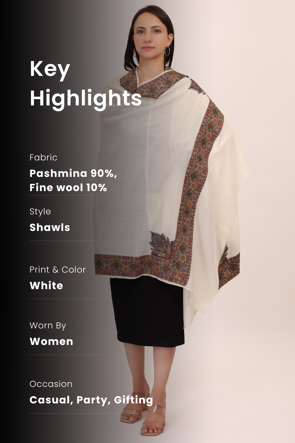 Experience timeless elegance with our pashmina fine-wool Shawl, crafted from the finest wool and adorned with exquisite hand-look embroidery. Soft, warm, and lightweight, this shawl offers versatile style and luxurious comfort, making it the perfect accessory for any occasion. Dimensions: 100*220cms Color: white base with multi-color embroidery