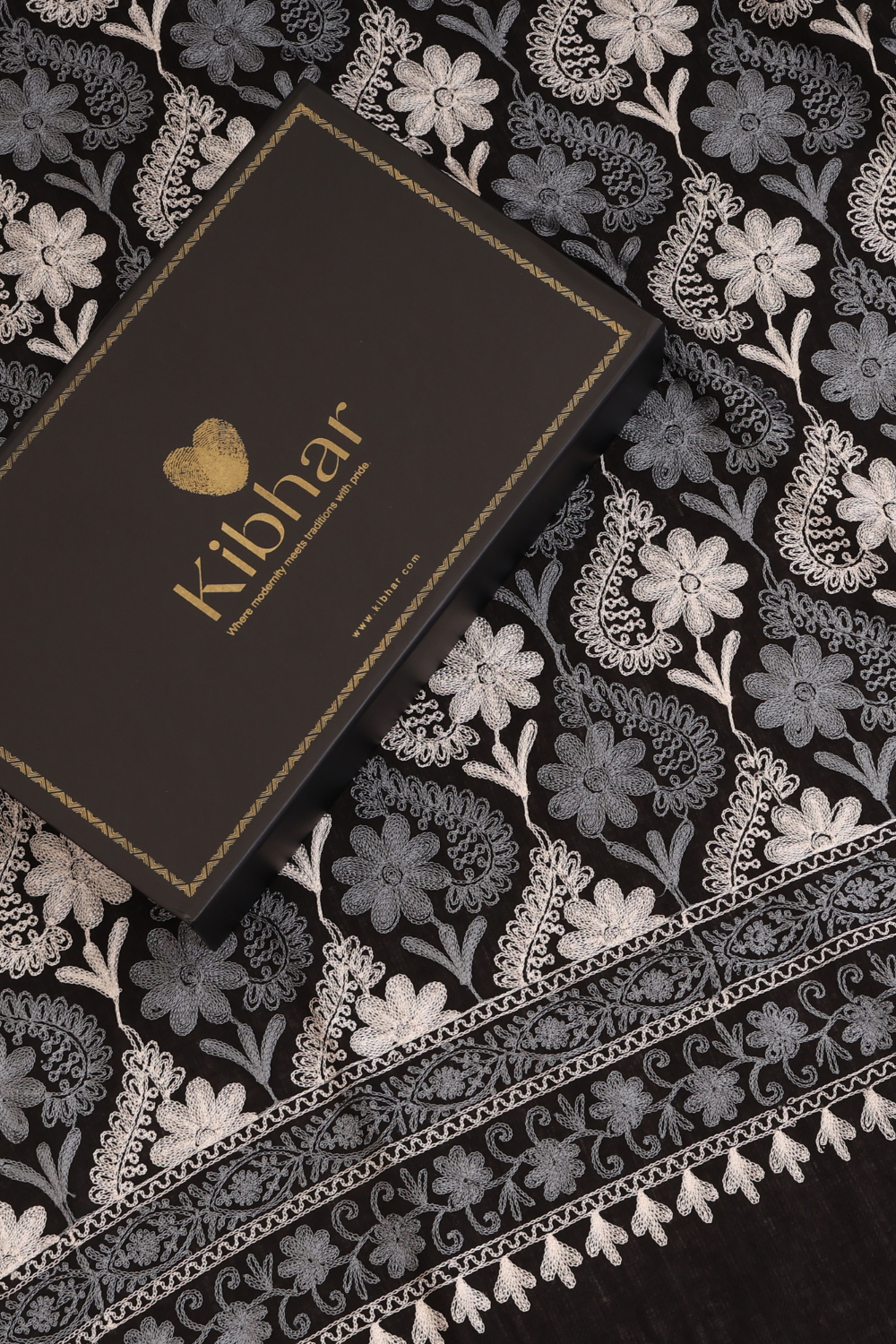 A fine wool embroidered stole is a luxurious accessory crafted from the highest quality wool, offering unparalleled warmth and softness. It features intricate nalki embroidery that adds a touch of elegance and sophistication, making it a perfect addition to any outfit for both formal and casual occasions. The delicate detailing and craftsmanship ensure that each piece is unique and timeless. Dimension: 75* 200 cms Color: black base with grey and white embroidery.