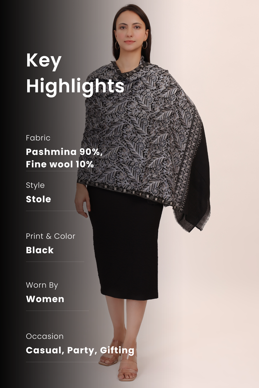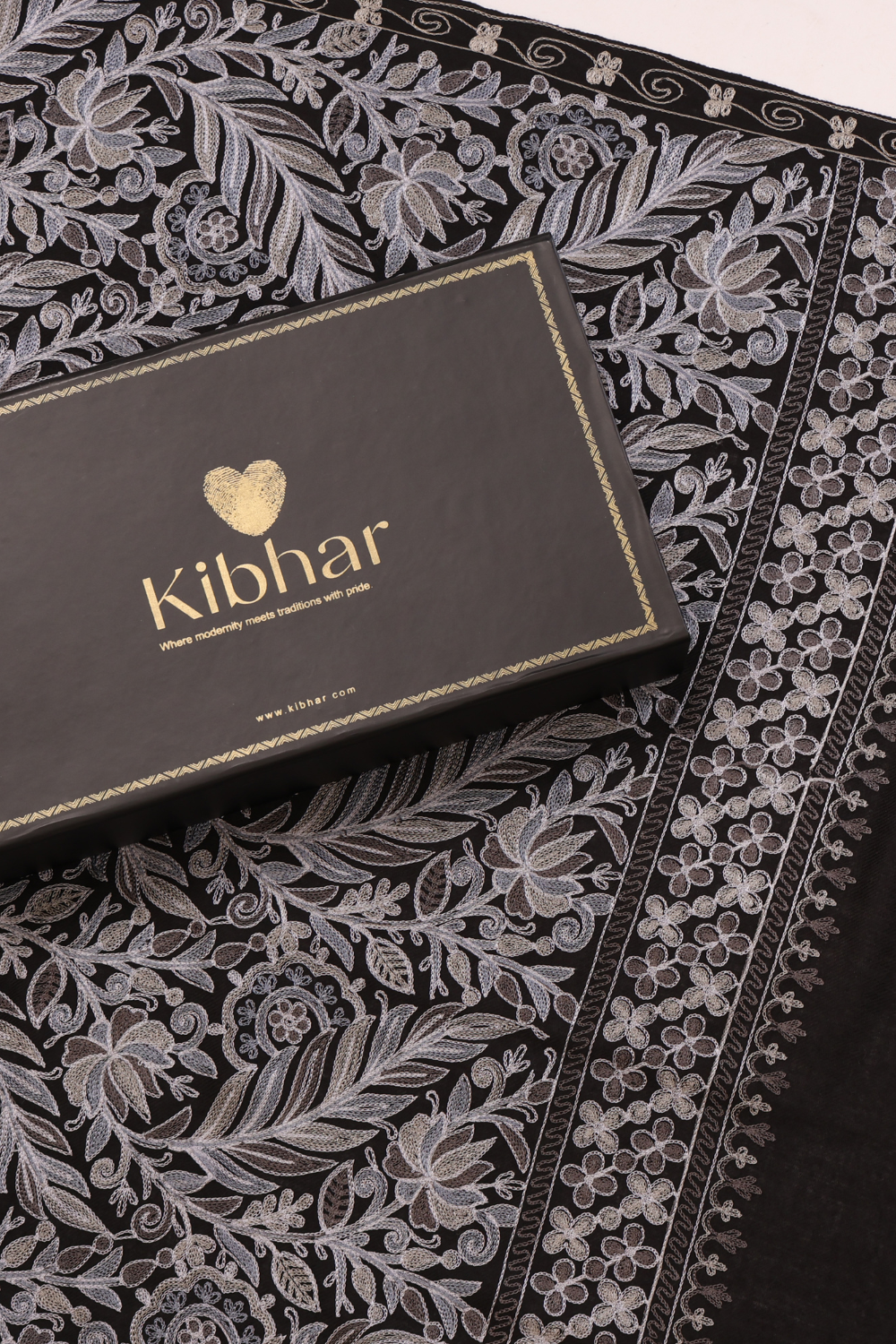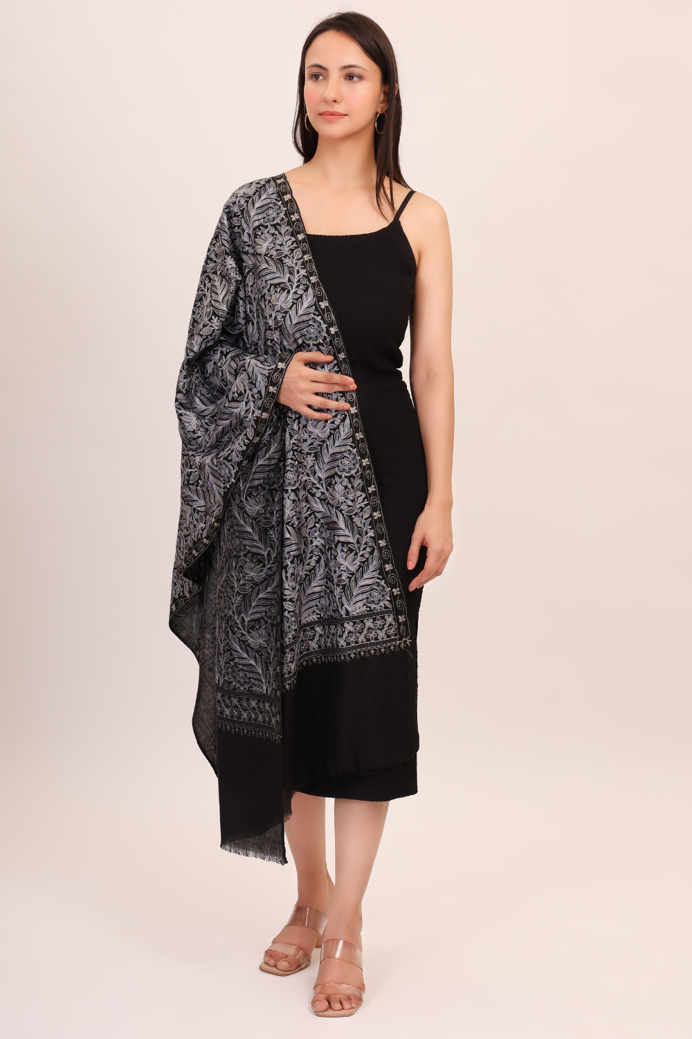 A fine wool embroidered stole is a luxurious accessory crafted from the highest quality wool, offering unparalleled warmth and softness. It features intricate nalki embroidery that adds a touch of elegance and sophistication, making it a perfect addition to any outfit for both formal and casual occasions. The delicate detailing and craftsmanship ensure that each piece is unique and timeless. Dimension: 75* 200 cms Color: white base with grey, steal, silver and greige embroidery.
